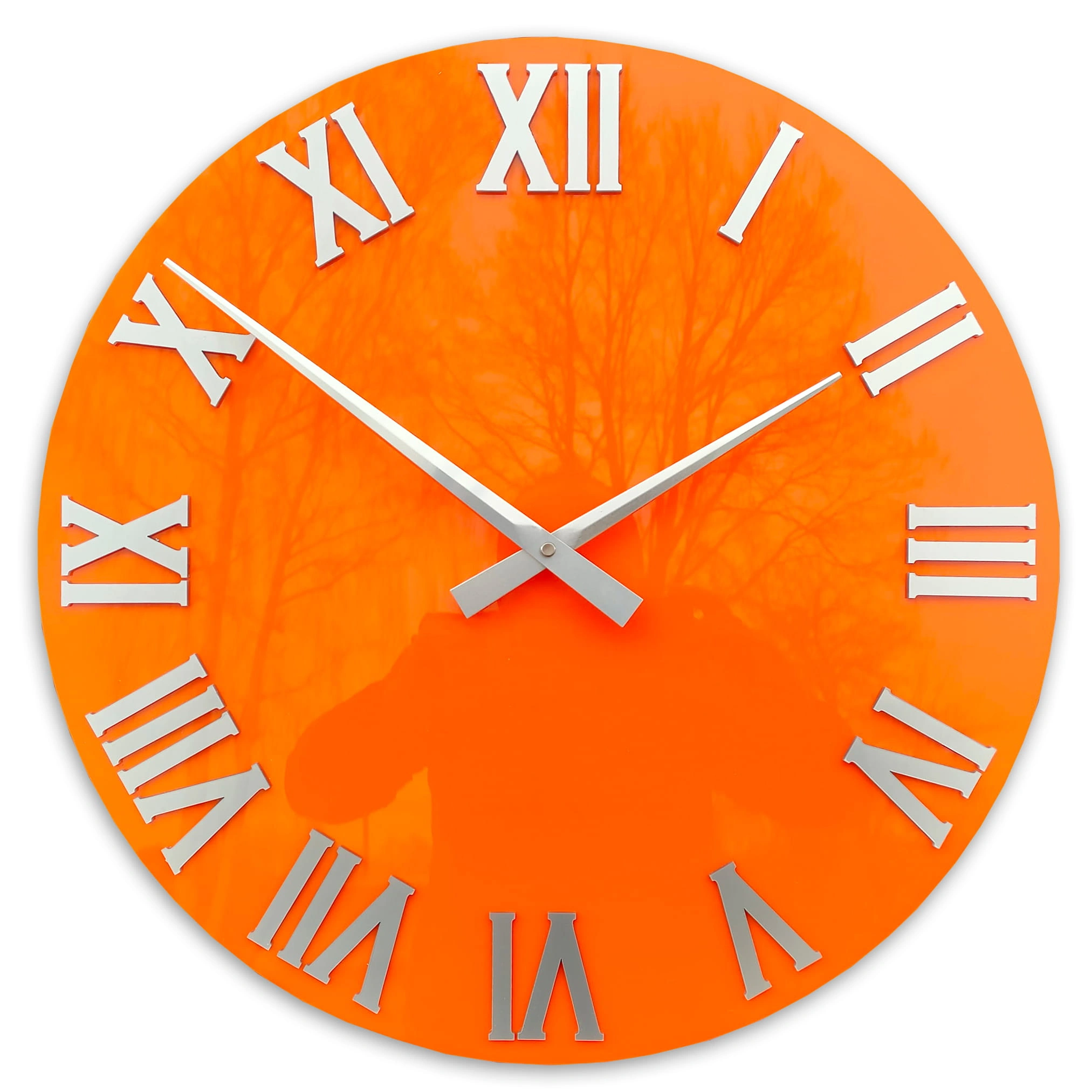 A unique and modern wall clock. Its simplicity and beauty captivates everyone who looks at it. Made of ORANGE acrylic glass and metallic aluminum numbers. Perfect for any interior, it is not only a clock, but also a beautiful decoration for your living room, room or office. Perfect as a gift.