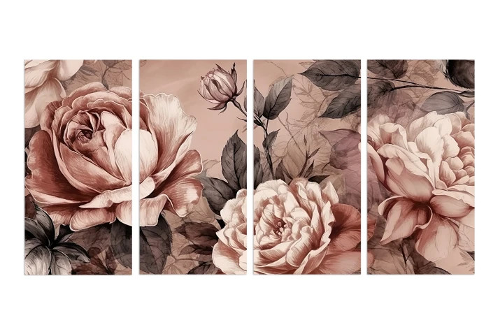The four-part painting Roses is a romantic-style decoration depicting beautifully painted, unfolding flowers of love. The entire composition is bathed in various shades of pink, not counting the leaves of the decorative plants. A charming composition that is perfect for any living room or hallway, especially for a feminine interior.