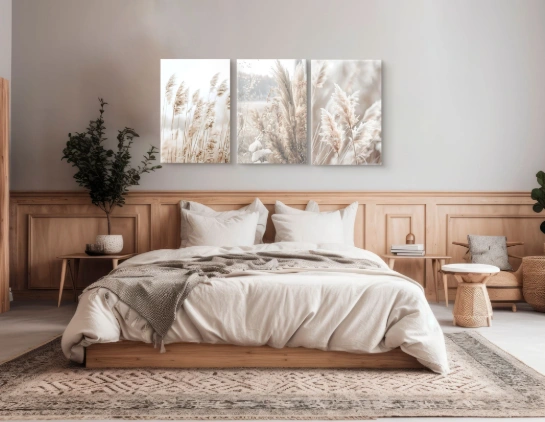Boho stiliaus trijų dalių paveikslas su subtiliu aukštų pampų žolių motyvu yra puikus pasirinkimas norint sukurti jaukią ir raminančią atmosferą namuose. Švelnios natūralios spalvos ir minimalistinis dizainas idealiai tinka tiek moderniam, tiek klasikiniam interjerui, suteikiant erdvei harmonijos ir gamtos akcentą.