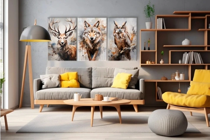 Šis modernus trijų dalių paveikslas (triptikas) atspausdintas ant aukštos kokybės drobės. Kiekviena dalis vaizduoja skirtingą laukinės gamtos motyvą: elnią, vilką ir pelėdą. Paveikslai sukurti skandinavišku stiliumi, naudojant natūralius miško elementus, kurie užpildo gyvūnų siluetus. Centrinė dalis išryškina nuostabų laukinio miško vaizdą, suteikiantį gylio ir harmonijos pojūtį. Ši dekoracija puikiai tiks svetainėje, miegamajame ar darbo kambaryje, suteikdama erdvei gaivumo ir estetikos.