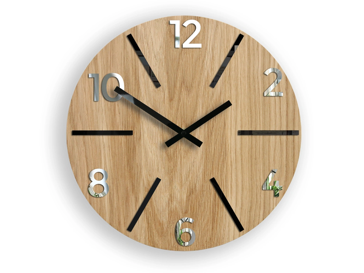 Medinis laikrodis su ąžuoliniu ciferblatu su juodais skaičiais ir sidabriniu veidrodžiu. Jo paprastumas ir grožis žavi kiekvieną, kuris į jį žiūri. Originali svetainės ar biuro puošmena, puiki dovanos idėja. Laikrodis supakuotas elegantiškoje dėžutėje.