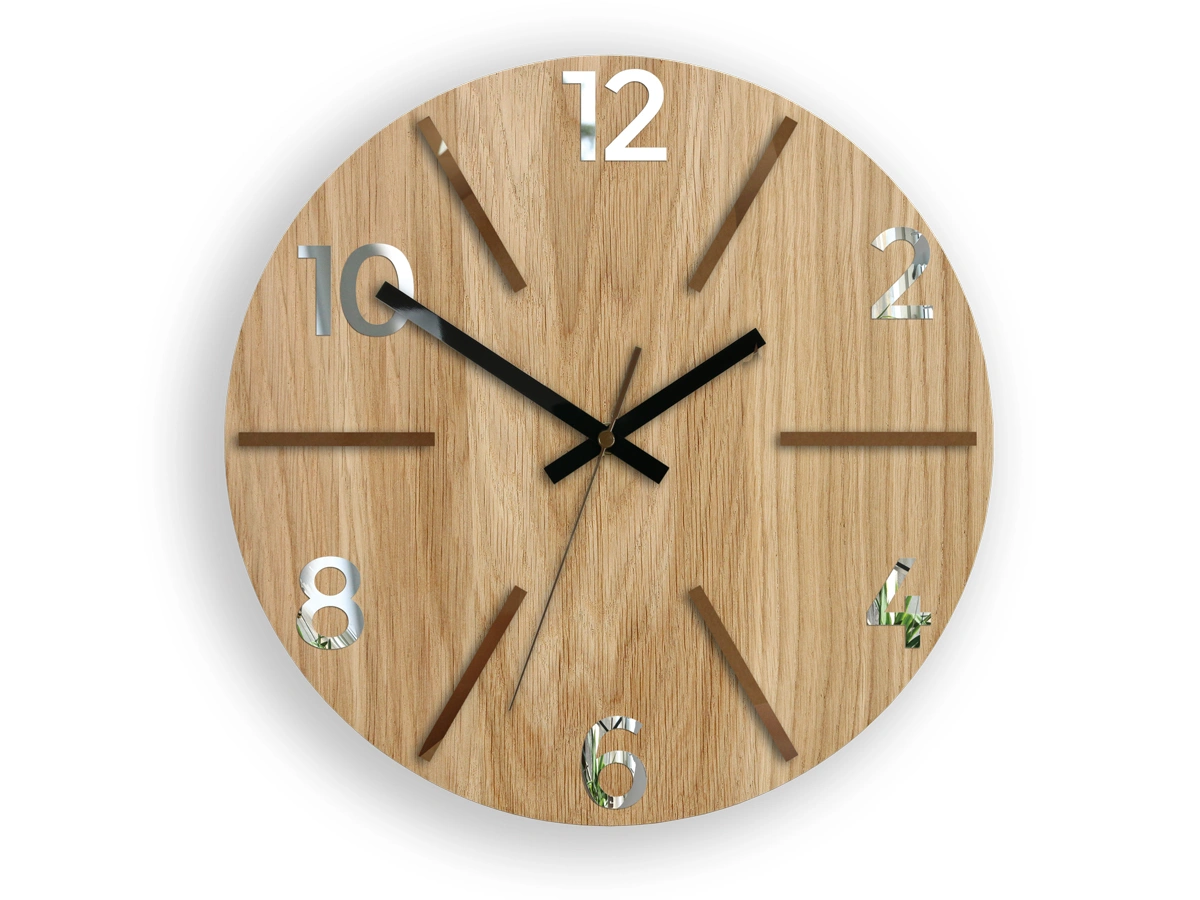 Sieninis laikrodis pagamintas iš 3 mm ąžuolo ir 10 mm MDF plokštės, masyvus ir rafinuotas kiekviename colyje. Tai suteikia labai elegantišką ir elegantišką charakterį. Savo ruožtu šiandien toks madingas ir noriai renkamas medinis laikrodis primena gamtą ir skandinavišką stilių.