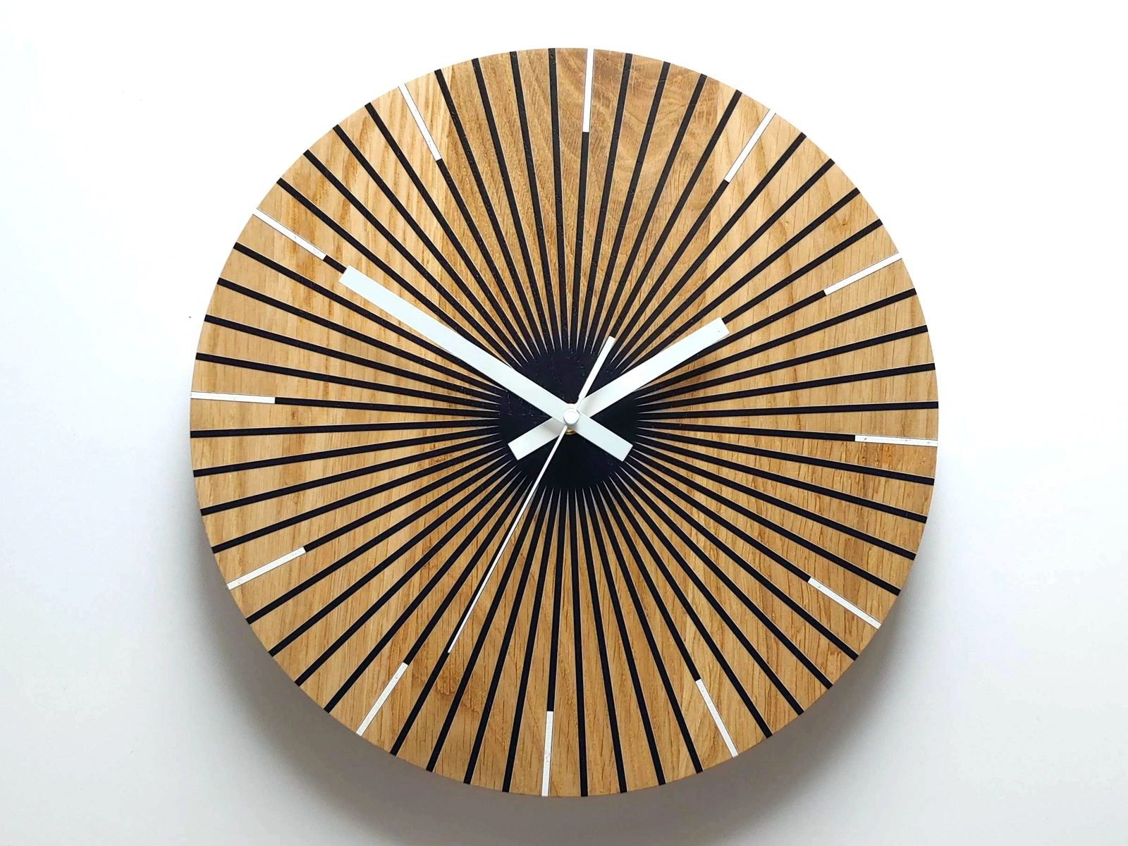 Unikalus ir modernus sieninis laikrodis iš ąžuolo medienos. Jis turi klasikinį apvalų laikrodžio ciferblatą su įdomia grafika. Šis laikrodis yra tipiškas dekoratyvinis laikrodis ir puikiai tiks bet kokiame interjere. Laikrodžių ciferblatus puošia dvi baltos rodyklės ir antra rodyklė. Šis laikrodis yra puiki dovanos idėja. Kiekviena kopija supakuota į elegantišką dovanų dėžutę.