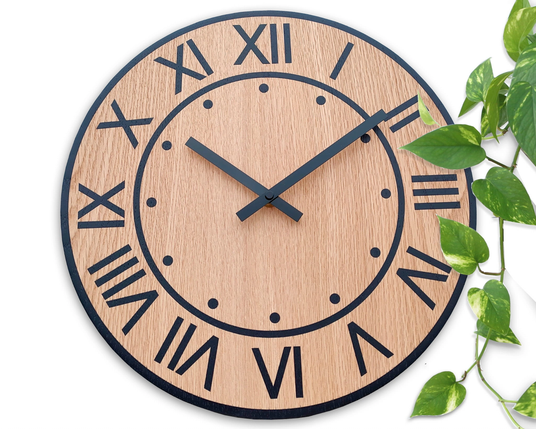 Unikalus ir modernus ąžuolinis sieninis laikrodis. Jis turi klasikinį apvalų laikrodžio ciferblatą su tiksliai atspausdintomis valandų žymomis romėniškais skaitmenimis. Šis laikrodis pasižymi elegancija ir darbo estetika. Puikiai dera prie bet kokio interjero, tai ne tik laikrodis, bet ir graži Jūsų svetainės, kambario ar biuro puošmena. Puikiai tinka kaip dovana. Kiekvienas laikrodis supakuotas į elegantišką dėžutę.