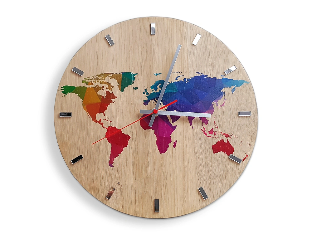 Sieninis laikrodis pagamintas iš 3 mm ąžuolo priekio ant MDF pagrindo. Laikrodžio ciferblate yra ryškus ir spalvingas pasaulio žemėlapis, suteikiantis labai elegantišką ir šiuolaikišką charakterį.
