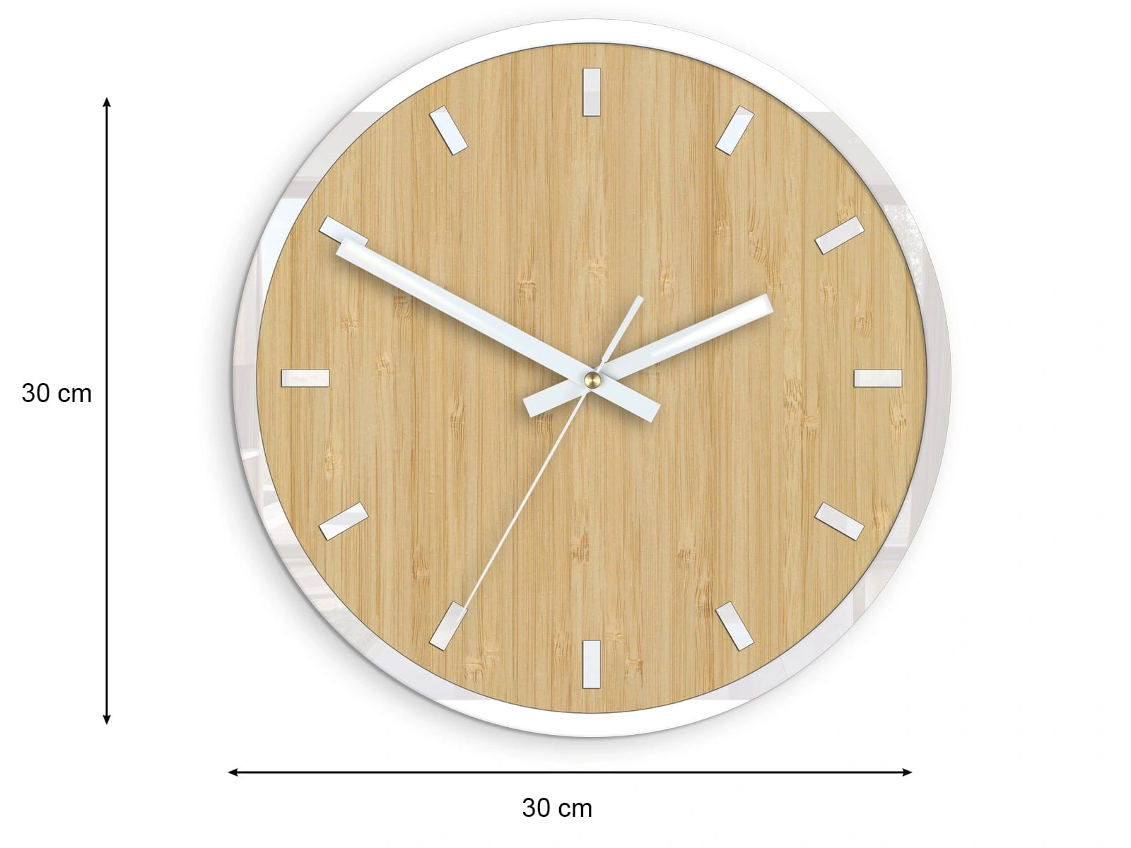 Klasikinis 30 centimetrų skersmens sieninis laikrodis su dvylika trumpų baltų valandų indeksų. Laikrodis pagamintas iš aukštos kokybės medžiagos, papildytas ciferblatu iš natūralios beržo faneros ir modernia balta apdaila. Laikrodis turi itin tylų mechanizmą, kuris netrukdys jums dirbant ar miegant.