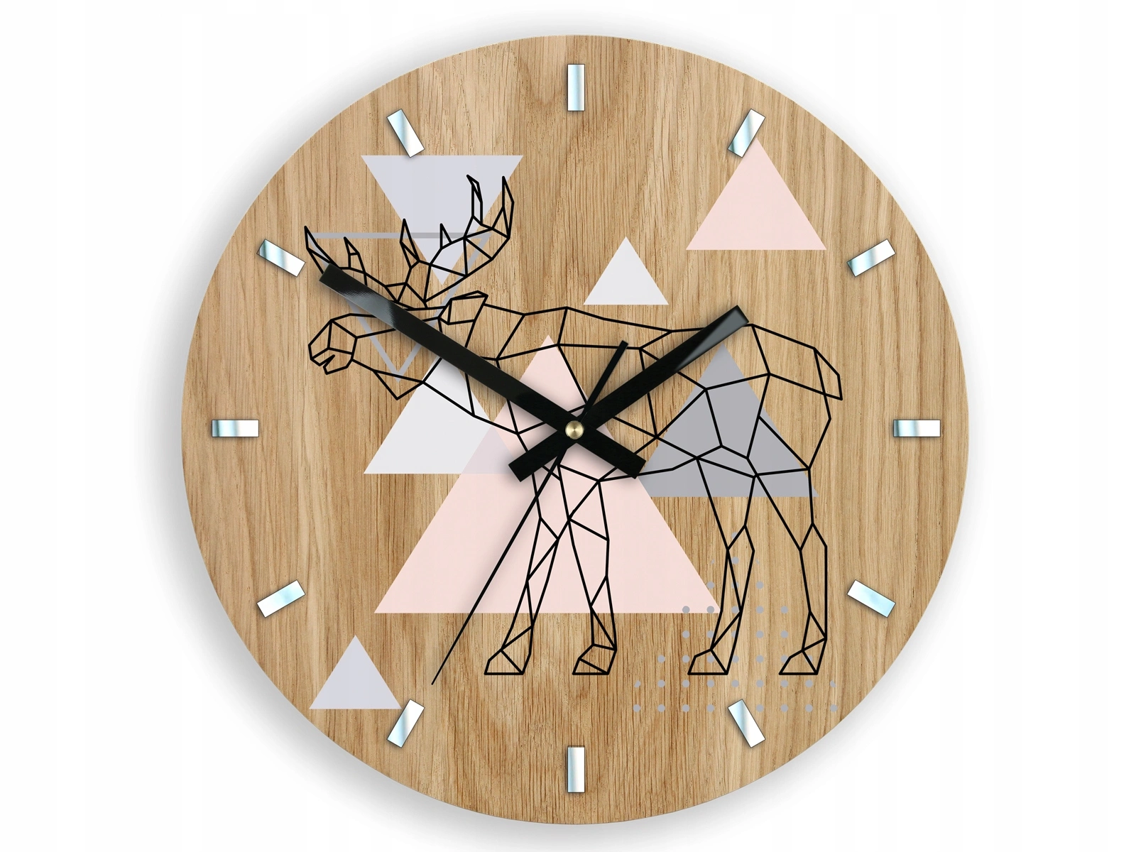 Sieninis laikrodis pagamintas iš 3 mm ąžuolo priekio ant MDF pagrindo. Laikrodžio ciferblate yra gyvas ir spalvingas geometrinio briedžio motyvas figūrų fone, suteikiantis itin elegantišką ir šiuolaikišką charakterį.
