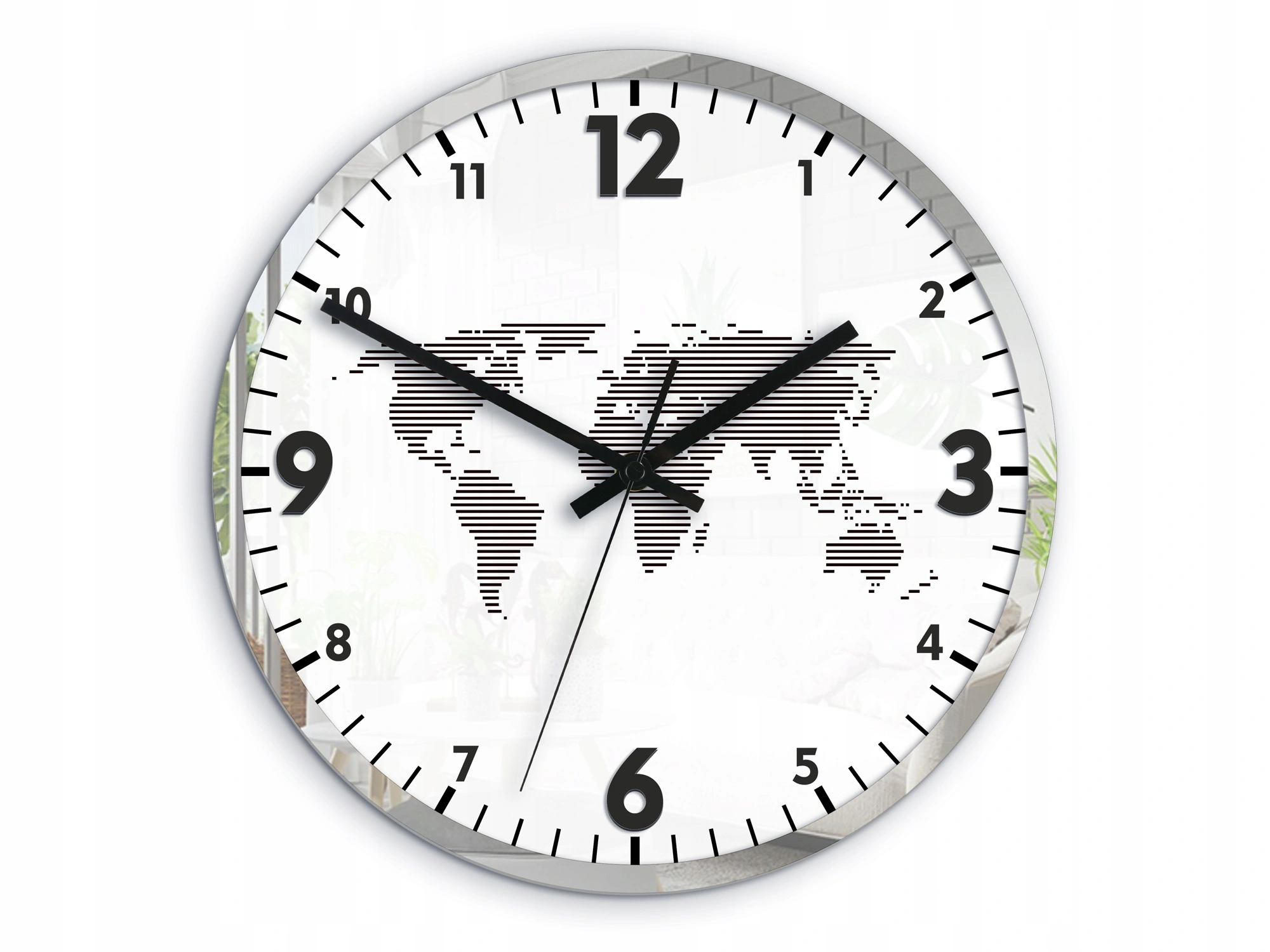Įdomus sieninis laikrodis su įskaitomu ciferblatu ir sidabriniu veidrodžio rėmu bei pasaulio žemėlapio motyvu. Originali svetainės ar biuro puošmena, puiki dovanos idėja. Laikrodis supakuotas elegantiškoje dėžutėje.