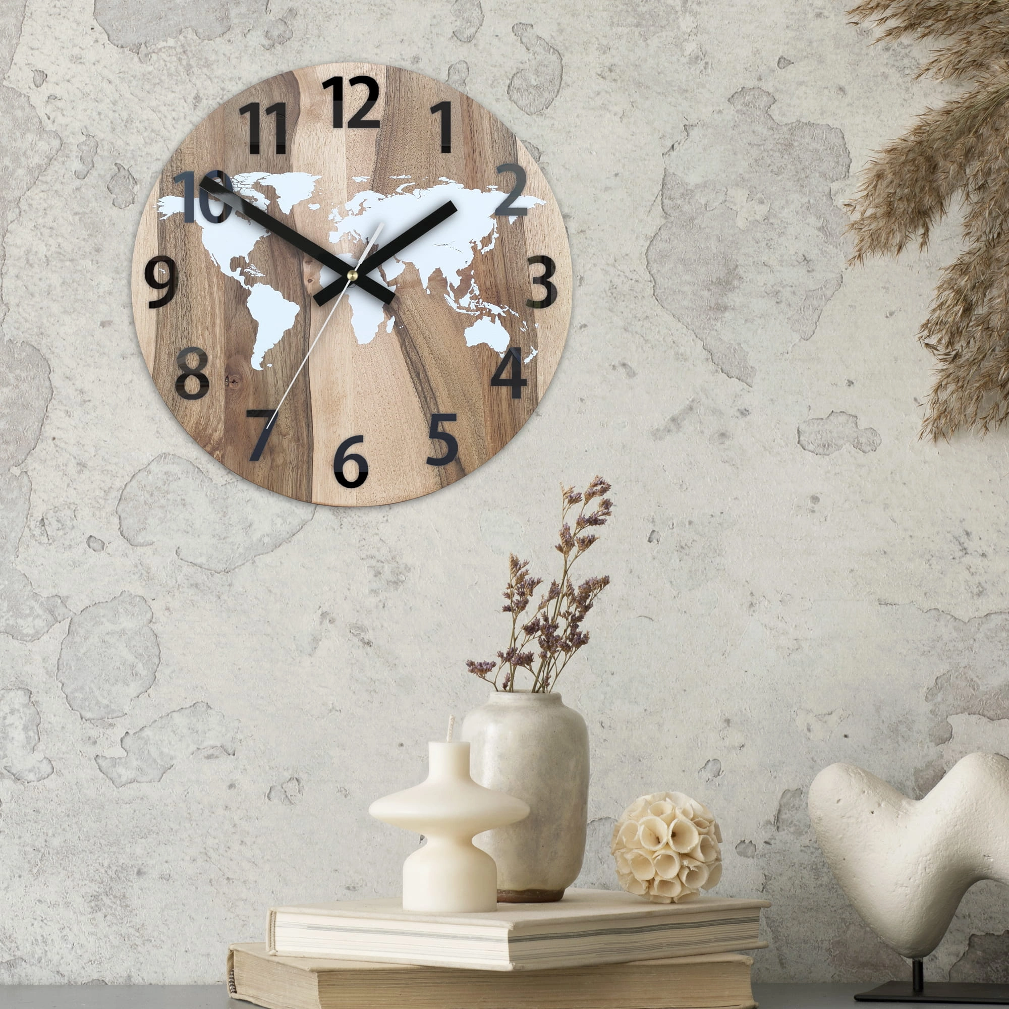 Ąžuolo WORLD sieninis laikrodis su pasaulio žemėlapio motyvu – masyvus ir tvirtas, pagamintas dėmesingai kiekvienai smulkmenai. Jame yra įskaitomas ciferblatas su aiškiais juodais skaitmenimis. Laikrodžio išvaizda primena skandinavišką stilių – natūralų ir šviesų interjerą. Jame sumontuotas itin tylus mechanizmas. Laikrodis taip pat supakuotas į elegantišką dėžutę, puikiai tinkančią dovanai.