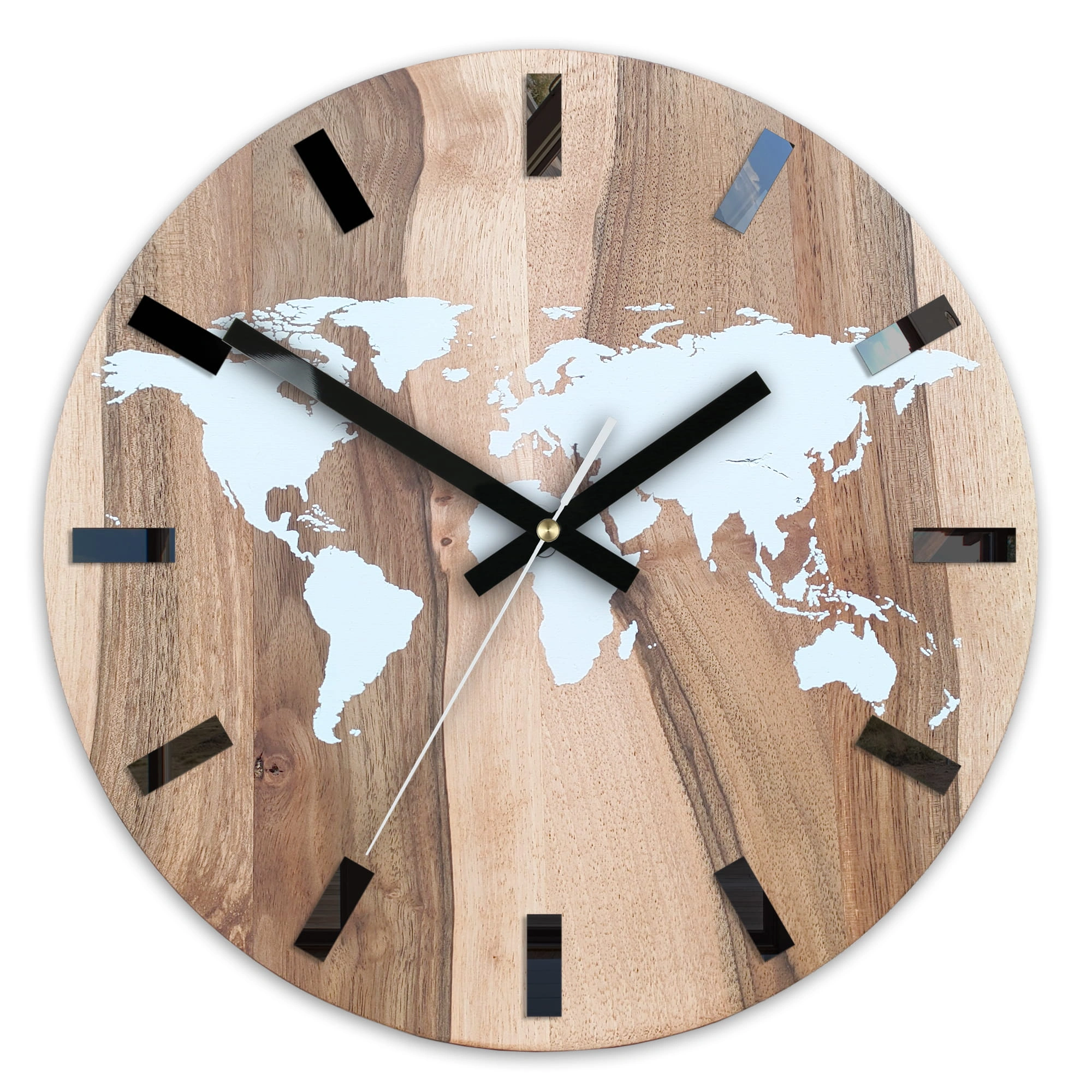 Sieninis laikrodis su pasaulio žemėlapio motyvu – masyvus ir tvirtas, pagamintas su dėmesiu kiekvienai detalei. Jame yra įskaitomas ciferblatas su aiškiais juodais skaitmenimis. Laikrodžio išvaizda primena skandinavišką stilių – natūralų ir šviesų interjerą. Jame sumontuotas itin tylus mechanizmas.