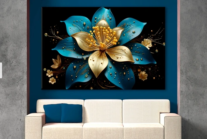 Mėlyna ir auksinė gėlė juodame fone