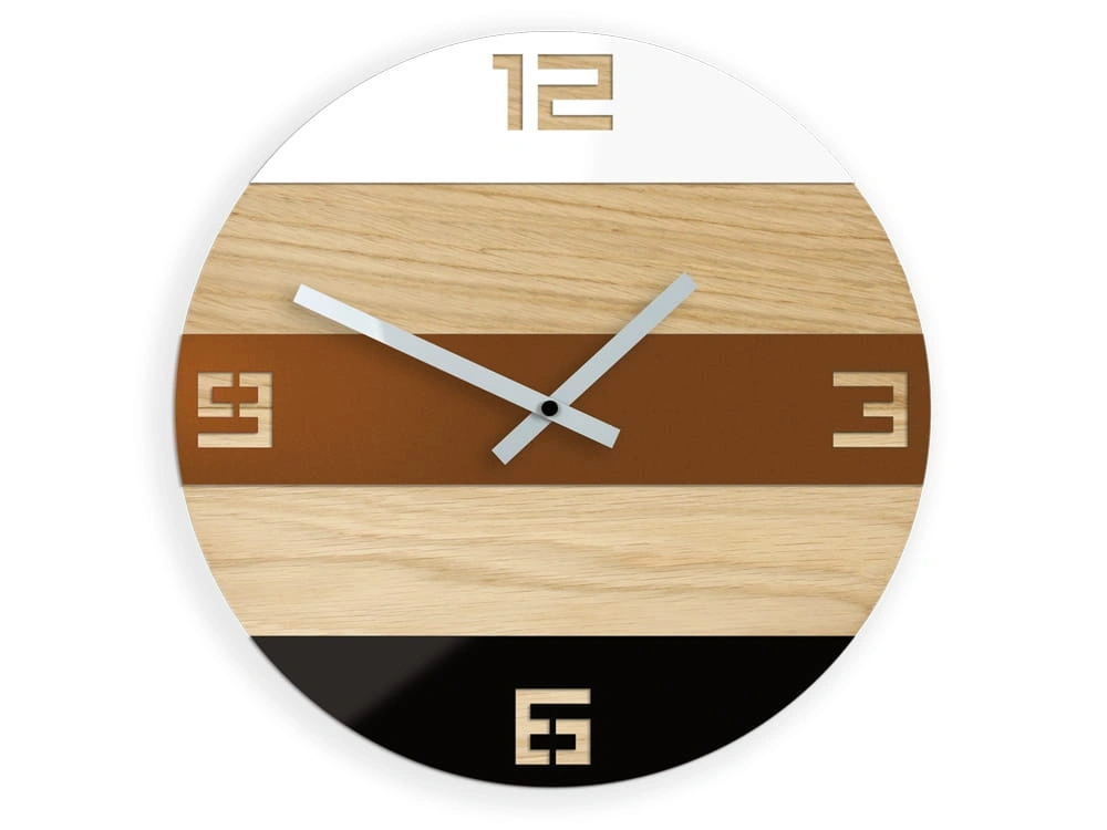 Modernus sieninis laikrodis, kruopščiai pagamintas iš natūralios medienos ir beržo faneros. Su trijų spalvų akrilinio stiklo juostelėmis. Visa tai papildo baltos rodyklės.