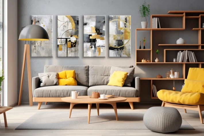 Šis abstraktus paveikslas susideda iš keturių dalių ir pasižymi šiuolaikišku dizainu, puikiai tinkančiu industrinio stiliaus interjerams. Jame dominuoja pilki ir auksiniai atspalviai, kurie sukuria elegantišką ir modernią atmosferą. Geometrinės formos ir linijos suteikia dinamiškumo, o spalvų derinys prideda prabangos pojūtį. Šis paveikslas gali tapti išskirtiniu akcentu jūsų namų ar biuro erdvėje, pritraukiančiu dėmesį ir papildančiu bendrą interjero dizainą.