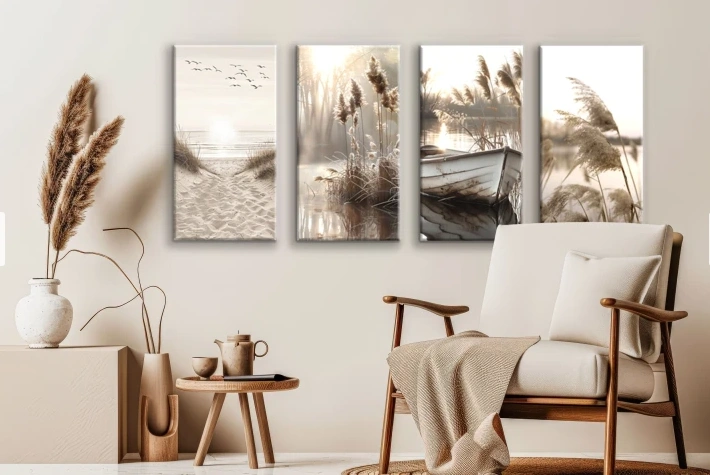 Šis keturių dalių paveikslas „Ramus vanduo ir žolės“ atspindi boho ir skandinaviško stiliaus estetiką. Kiekviena iš keturių dalių vaizduoja ramius vandens telkinius ir švelniai siūbuojančias žoles, sukuriant harmonijos ir ramybės jausmą. Švelnios spalvos ir minimalistinis dizainas puikiai dera prie šiuolaikinių interjerų, suteikdami jiems natūralumo ir elegancijos.