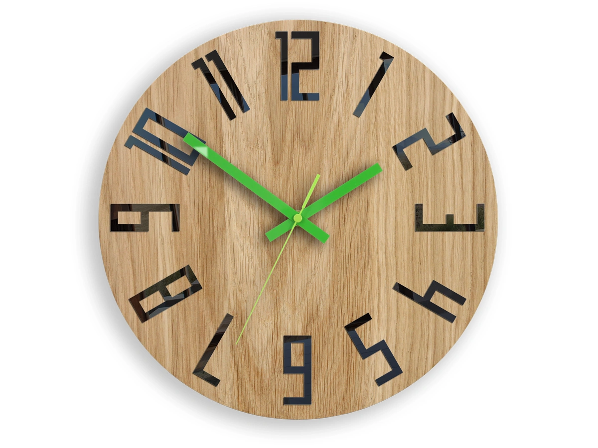 Laikrodis pagamintas iš 100% natūralaus ąžuolo ir MDF plokštės. Ciferblato sluoksnis yra 100% ąžuolas – štai kodėl nėra dviejų vienodų laikrodžių. Kiekviename laikrodyje medienos raštas skiriasi. Laikrodis impregnuotas natūraliu bičių vašku.